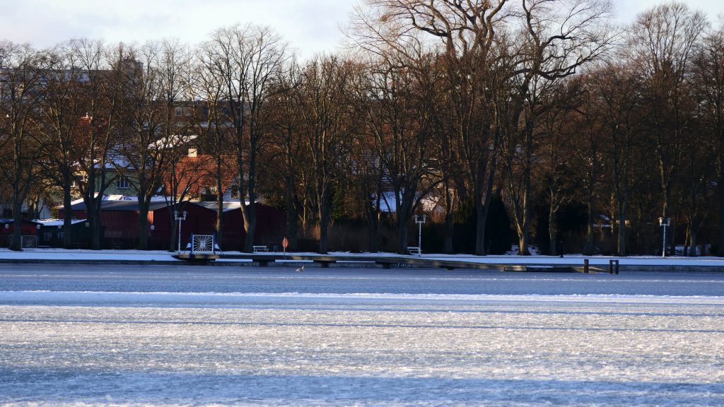 Aber wenn der Sund eine Eisschicht bekommt und der Bootssteg eingefroren ist, dann sieht es so aus: Das Tor zum Steg bleibt geschlossen, die Boote liegen in der Halle.